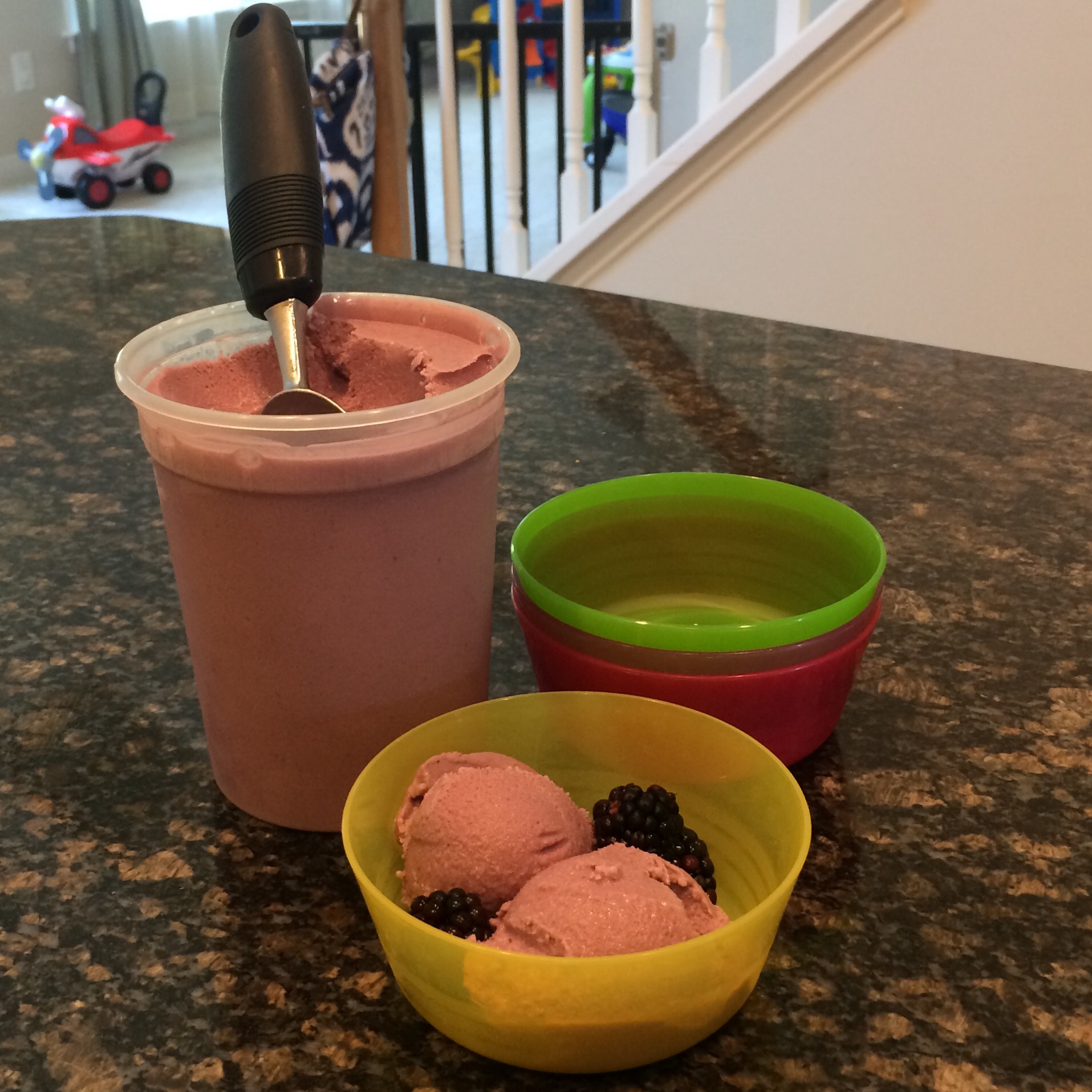 Our next venture into blackberry heaven was homemade ice-cream, inspired by this Pinterest recipe. I wanted to cut the calories a little (so I could continue eating cobbler for breakfast), so I substituted Greek yogurt for half of the heavy cream and used coconut milk instead of whole milk. Greek yogurt made the ice cream amazingly creamy, and its healthy bacteria can withstand freezing.